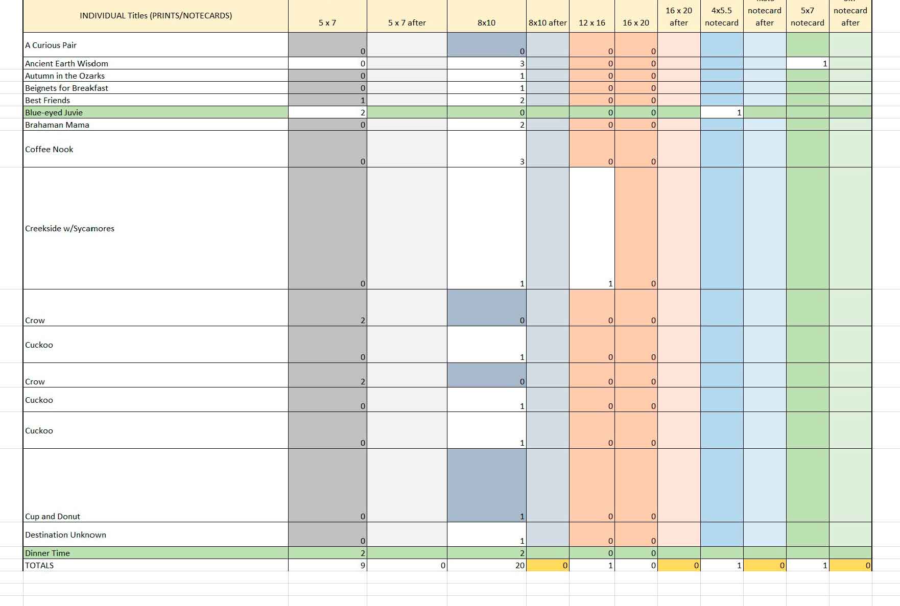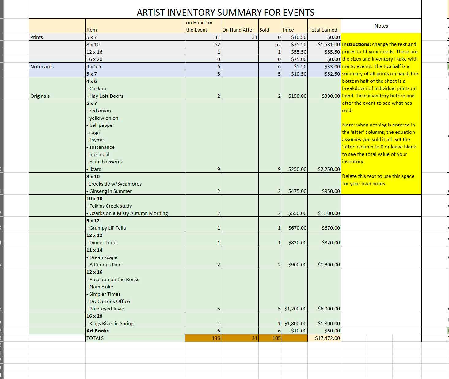 Use this artist event inventory spreadsheet to track your inventory and sales at shows and events, or use this spreadsheet to keep track of your studio and gallery inventory.
